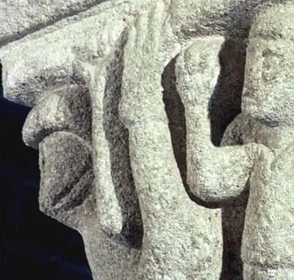 Sur ce chapiteau l'angle droit de la corbeille est occupé par un personnage assis sur les fesses, au faciès, aux mains et aux pieds étirés vers le haut, simiesques. La présence d'un sexe (martelé) confirme son animalité. Au 12e siècle le sexe humain continue encore à être masqué ou voilé sur les statues et les peintures religieuses.