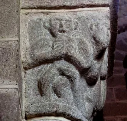 Sur la face gauche du chapiteau, un personnage au tronc fléchi, tête inclinée, courbé derrière un masque muni d'une poignée suspendue à l'angle supérieur, masque qu'il tend à bout de bras.